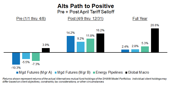 As we noted in our Market Overview, returns in 2025 can be viewed as unfolding in two distinct phases: a challenging start followed by a powerful recovery. That pattern held true for our favored alternatives strategies, as well. Those markets and strategies did take longer to recover than either stocks or bonds, but they each ultimately navigated the year profitably.