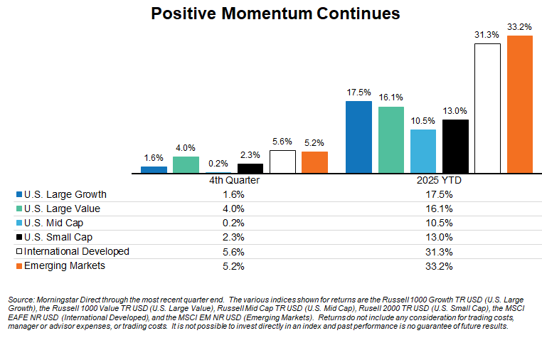 The fourth quarter of 2025 delivered a fitting close to what ended up being a standout year for financial markets. While the final months were not without their moments of volatility, the overall trend remained positive – something that has been a theme since last spring. Equities again finished higher, supported by easing inflation pressures and a more accommodative Federal Reserve. Credit markets remained orderly, and diversification once again proved its value as areas other than U.S. stocks and bonds contributed in meaningful ways. There were certainly stronger three-month periods during the year, but the final quarter provided a solid finishing touch to an already impressive 2025 for investors.