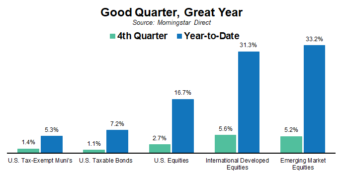 Equity markets delivered another solid, if not spectacular, quarter with broad-based gains. U.S. equities delivered gains for investors both for the quarter and the year, but international developed and emerging market stocks continued to stand out. The return differences were not as notable as earlier in the year, but positive momentum continued and again provided a nice boost to returns for investors that remained globally diversified. Within equities, the story for the year was clearly international stocks and they were again a topic of conversation for one of our quarterly videos.