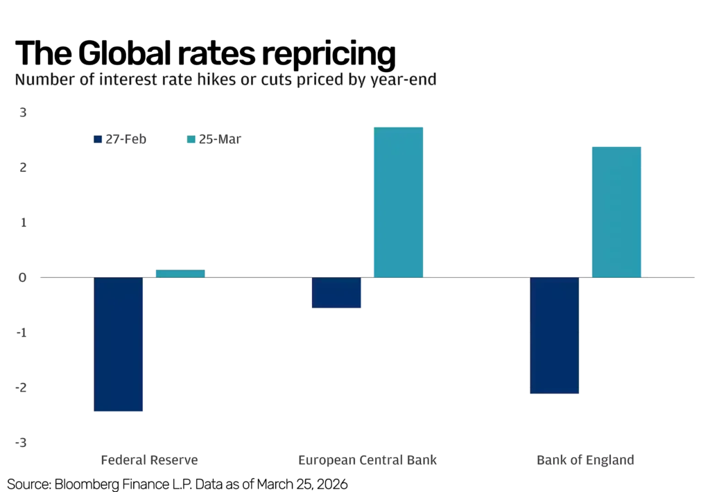Concerns around inflation came back into focus, especially with the potential for prolonged disruption in energy markets. As a result, expectations for central banks shifted meaningfully. Rate cuts were pushed out, and in some cases, markets began pricing in the possibility of rate hikes.