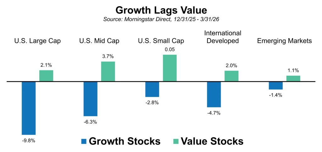 One trend that did continue was the gap between value and growth stocks. Growth had already been lagging heading into the conflict, and that remained the case through quarter-end. The difference was most noticeable in U.S. large-caps, but it was not limited to that segment.