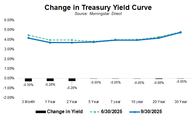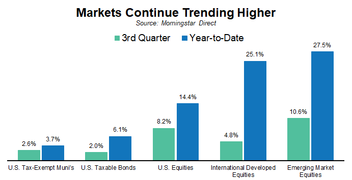 The third quarter was another positive one for investors with both stocks and bonds finishing higher. There was no shortage of geopolitical news and events the past few months, but there was also very little evidence of that in financial market returns. Returns were broadly positive and the VIX or Volatility Index (sometimes also referred to as the Fear Index) stayed in a rather low, narrow range of 14 to 20 throughout the quarter – after spiking to more than 57 during the April tariff announcement related selloff.