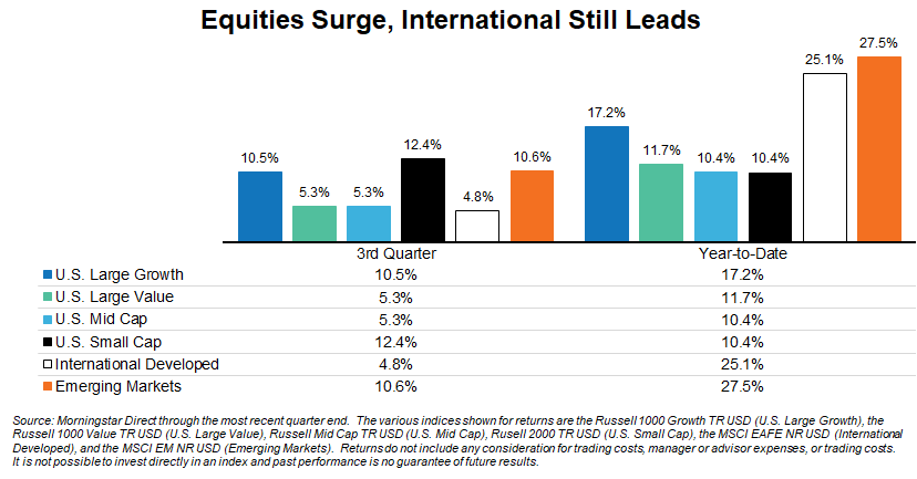 Stocks surged for a second consecutive quarter and the tariff-induced April selloff feels increasingly like a distant memory. Global equities are now up a remarkable 33.6% since the April lows. Compared to the large swings in performance during the second quarter, this past quarter was relatively uneventful. Stocks moved noticeably higher in total, but the monthly returns of +1.4%, +2.5%, and +3.6% weren’t particularly noteworthy on their own.