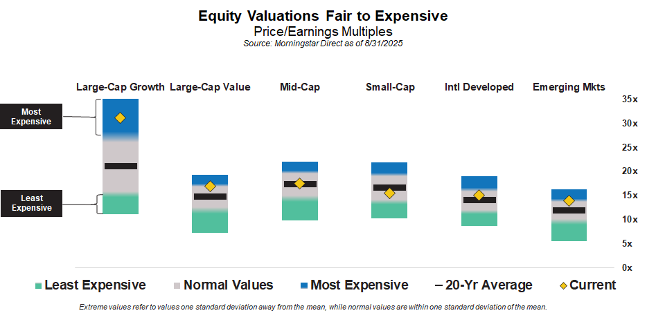 Similar to prior quarter, the magnitude of gains in the most recent quarter would be considered solid for an entire calendar year period. Those types of returns tend to raise valuation levels and, in our opinion, should lower future return expectations. Solid earnings growth and a Federal Reserve at the start of a rate cutting campaign helped markets build positive momentum, but valuations increasingly appear stretched in some segments. Using forward looking earnings projections, U.S. large cap growth and value, as well as emerging markets, now skew expensive (blue shaded area).