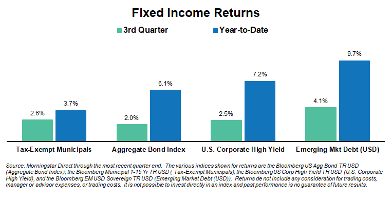 Tax-exempt municipals were a particular highlight during the quarter. Municipals struggled to keep up with other fixed income segments early in the year due to heavy new issuance supply and even some concerns related to their tax-exempt status. We expected they’d eventually recover and close the gap, but sometimes that can take an extended period of time. With strong recent performance, that gap has mostly closed with the nominal return spread for the year closer to historical norms.