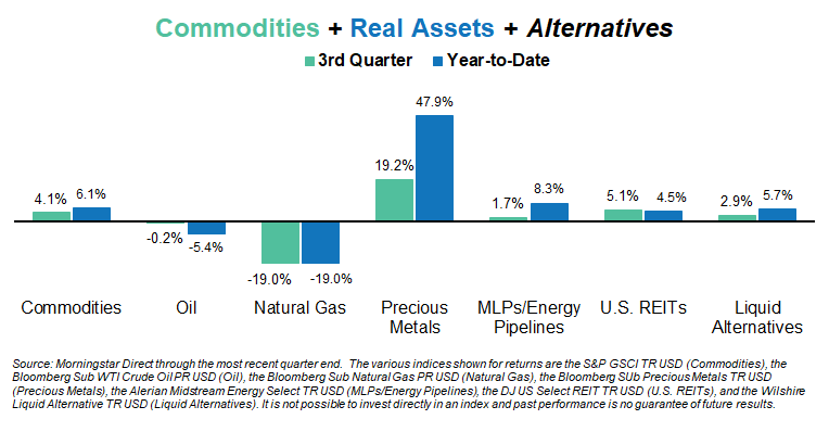 For clarification purposes please note that our listing of commodities, real assets, alternatives and returns for the period shown is far from an exhaustive list. We’ve chosen to show broad indices or specific strategies because they tend to be areas of interest for investors and/or areas that we own in client portfolios.