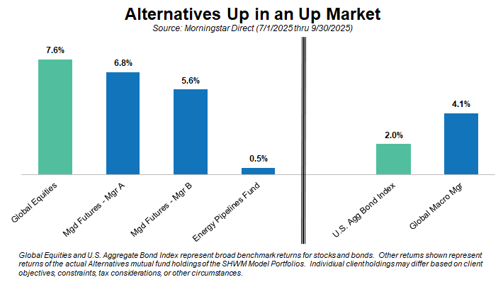 Our approach with regard to alternatives has been to focus on investments that have low long-term correlations to traditional markets. We already have exposure to traditional markets – so what does an investor really gain by adding more? The obvious goal or expected benefit is that uncorrelated investments have a chance of doing well even when stocks and bonds perform poorly. There is never a guarantee, of course, and that applies in the opposite direction, as well. Just because stock and bond markets are up it doesn’t mean that the type of Alts we favor will lose money. This quarter was a good example of that as the illustration shows. The mint green bars represent the returns for traditional markets, whereas the blue bars represent returns for our model portfolio alternatives holdings.